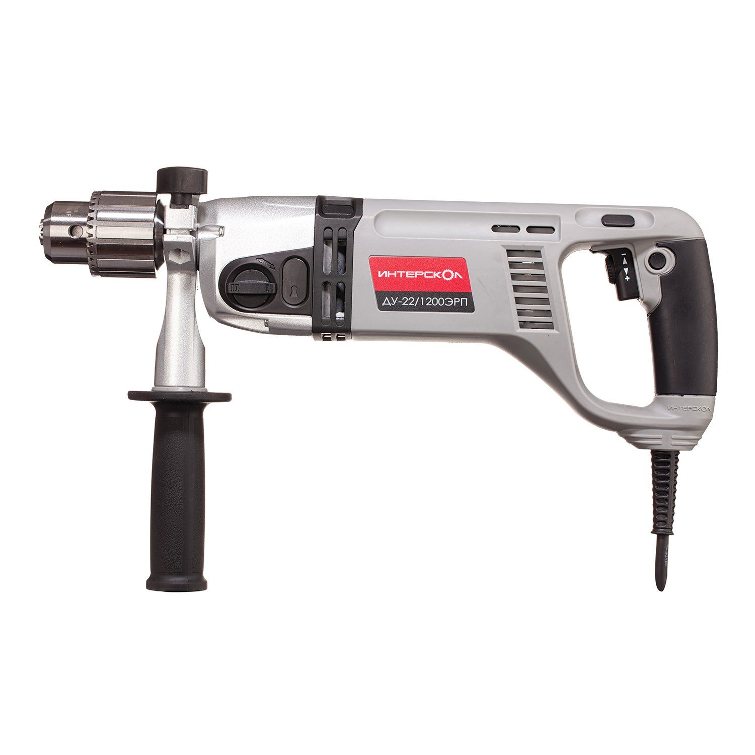 Дрель ударная Интерскол ДУ-22/1200 ЭРП - тяжелая дрель с D-образной рукояткой, предназначенная для сверления отверстий большого диаметра и глубины. Переключатель диапазонов скоростей - слева на редукторе. Рядом расположена кнопка блокировки шпинделя. Переключатель режимов сверления и сверления с ударом находится в верхней части редуктора. Рычажок реверса — над пусковой клавишей, такой переключатель реверса гораздо труднее сломать, чем надкурковый флажок. В редукторе дрели установлена муфта предельного момента, защищающая оператора от травм, а механизм дрели от разрушения при заклинивании сверла. Ключевой патрон на 16мм позволяет надежно фиксировать крупную оснастку.