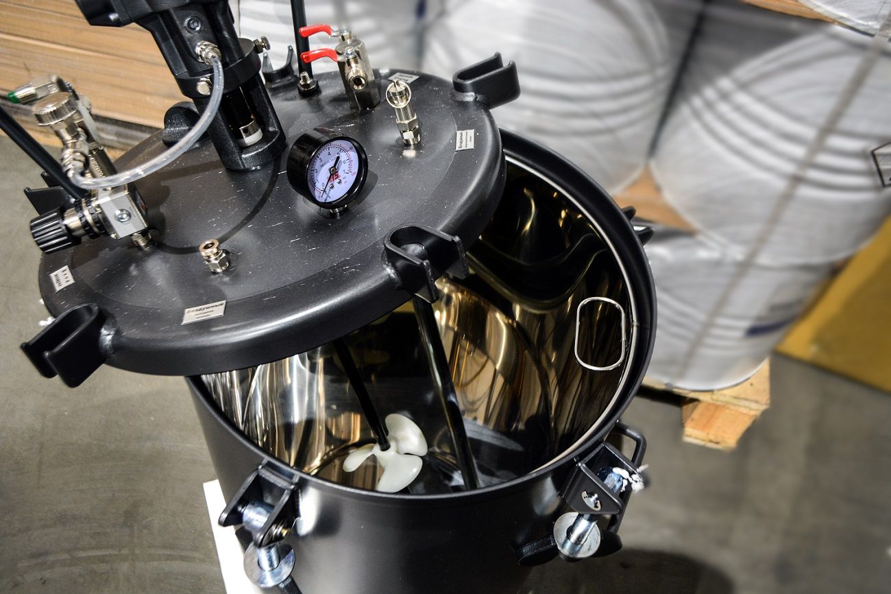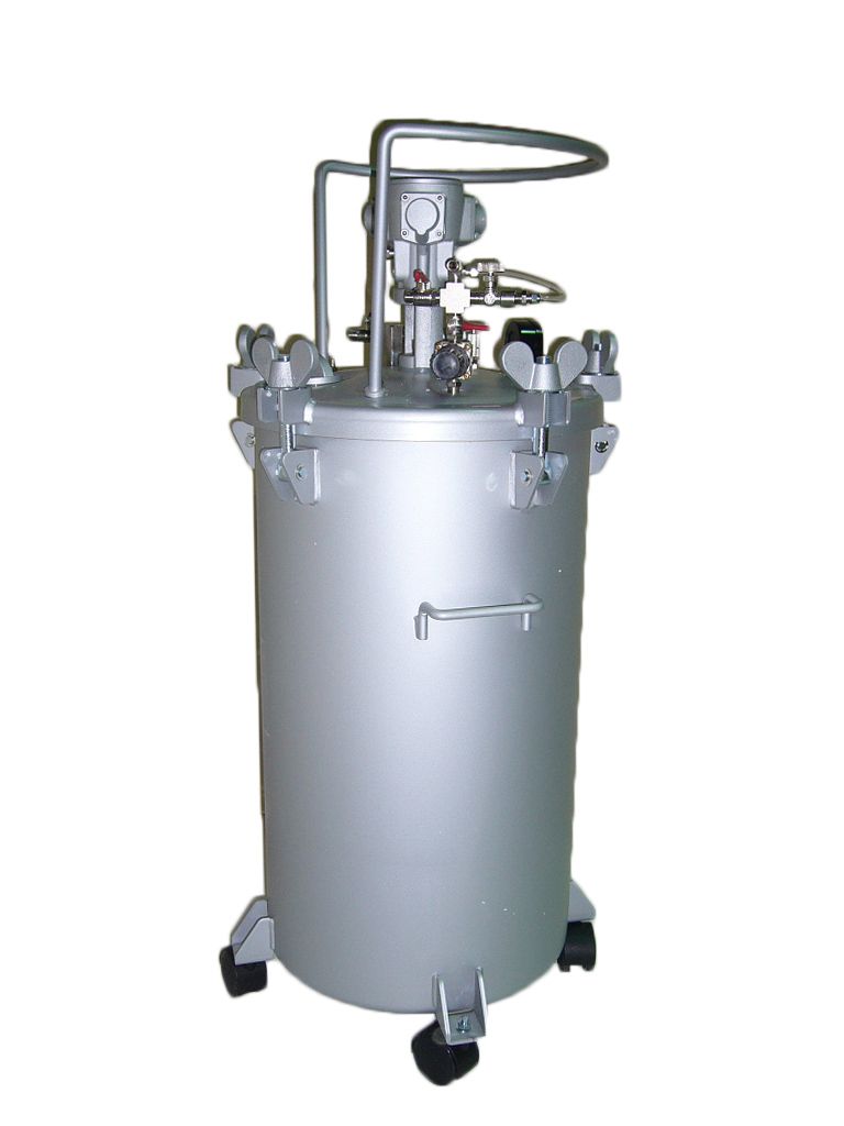 Предназначен для подачи готового, тщательно перемешенного лакокрасочного материала к краскораспылителям при производстве окрасочных работ, а также для перемешивания находящегося в нем ЛКМ. Бак укомплектован автоматическими пневмомешалками, проводом заземления, усиленными колесами, двойным шлангом для распылителя 5м с фитингами, вставной емкостью из нержавеющей стали, предохранительным клапаном.