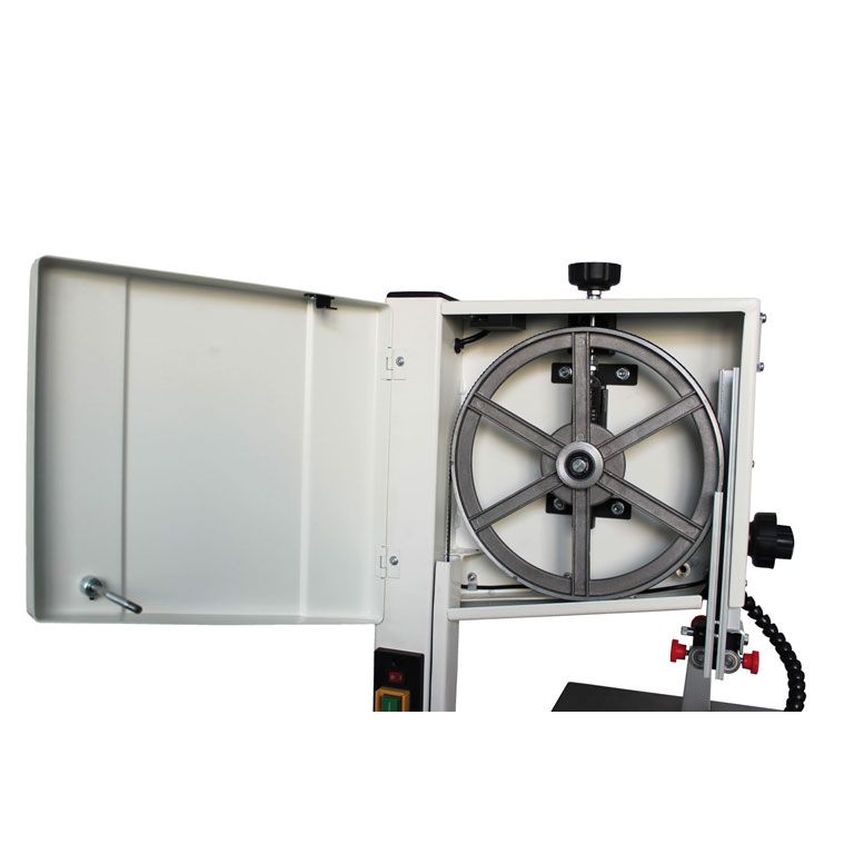 Механизм натяжения пильной ленты оборудован индикатором силы и рычагом для быстрого ослабления перед хранением; при его использовании настройки не сбиваются. Направляющие полотна трехроликовые с подшипниками качения, такой вариант считается наиболее долговечным, меньше всего изнашивает полотно, не приводит к его нагреву от трения. Двери корпуса пилы зафиксированы винтами с барашковой рукояткой, что обеспечивает доступ к механизму для его наладки и надежное запирание без использования вспомогательного инструмента вроде отверток или гаечных ключей.