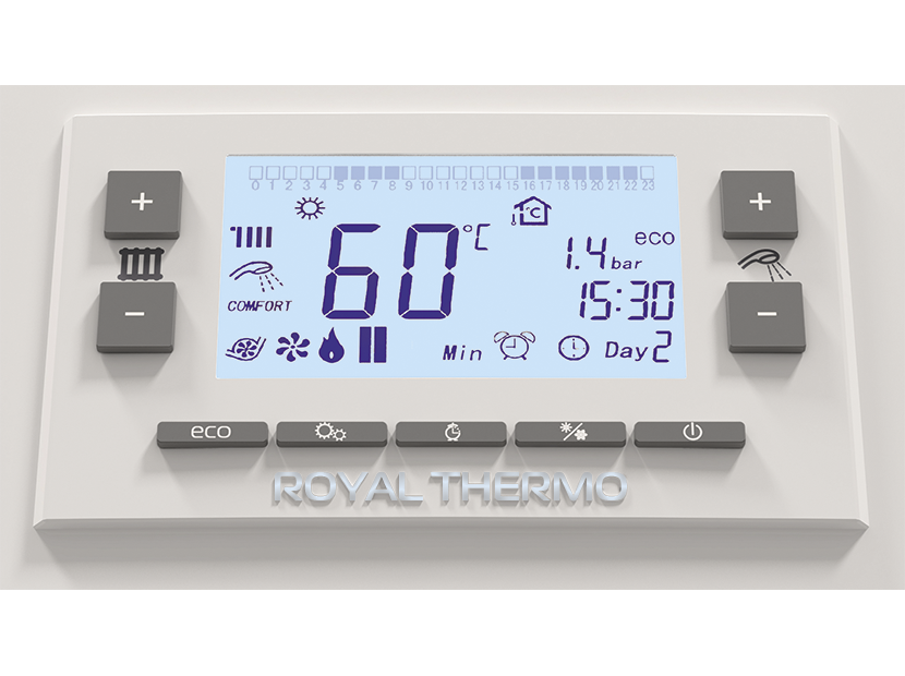 Котлы полностью автоматизированы, удаление дымовых газов происходит турбированным способом за счет принудительной тяги. Камера сгорания закрытая. Такие возможности оборудования , как FULL Restart - перезапуск при перебоях с подачей газа и электричества, уникальная конструкция горелки и надежный газовый клапан, а также проверенная временем 3-электродная система розжига и контроля пламени не оставят ваш дом без тепла. Функции Сomfort для горячего водоснабжения, возможность использования комнатного термостата или режим работы от датчика уличной температуры, а также другие уникальные особенности прибора обеспечат вас максимальным уровнем комфорта при использовании котельного оборудования Royal Thermo.