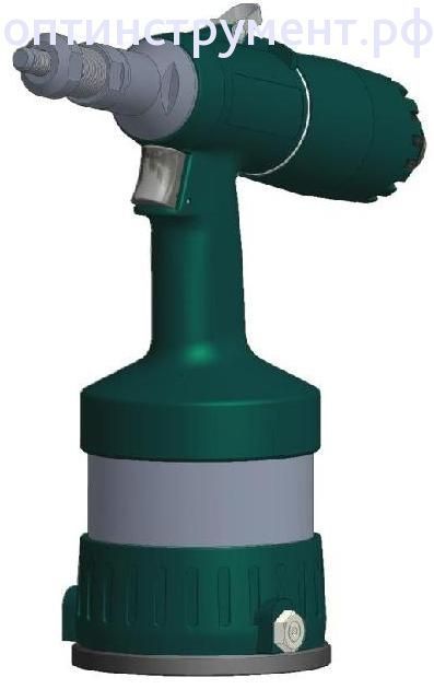 Удобный, высокопроизводительный и надёжный заклепочник, предназначенный для установки заклепок больших размеров. Оснащён реверсивным пневматическим двигателем, осуществляющим установку заклепки, а также закручивание и выкручивание насадки. Возможность регулировки рабочего хода позволяет задать оптимальные параметры для работы с различными видами заклепок. Управление всеми функциями осуществляется с помощью всего лишь одной кнопки. Предназначен только для установки гаечных заклепок. В стандартной комплектации насадки для установки гаечных заклепок М8-М14.