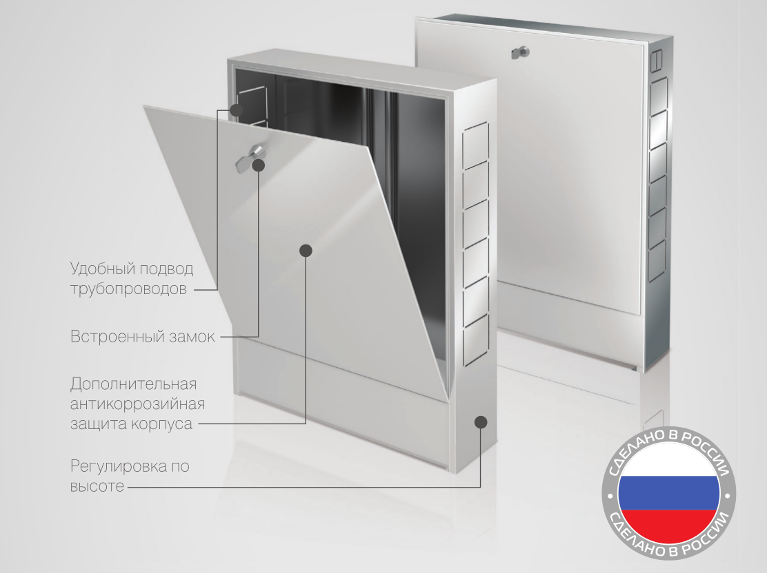 В боковых стенках корпуса шкафа выполнена перфорация, сегменты которой удаляются в любом удобном месте для подсоединения трубопроводов